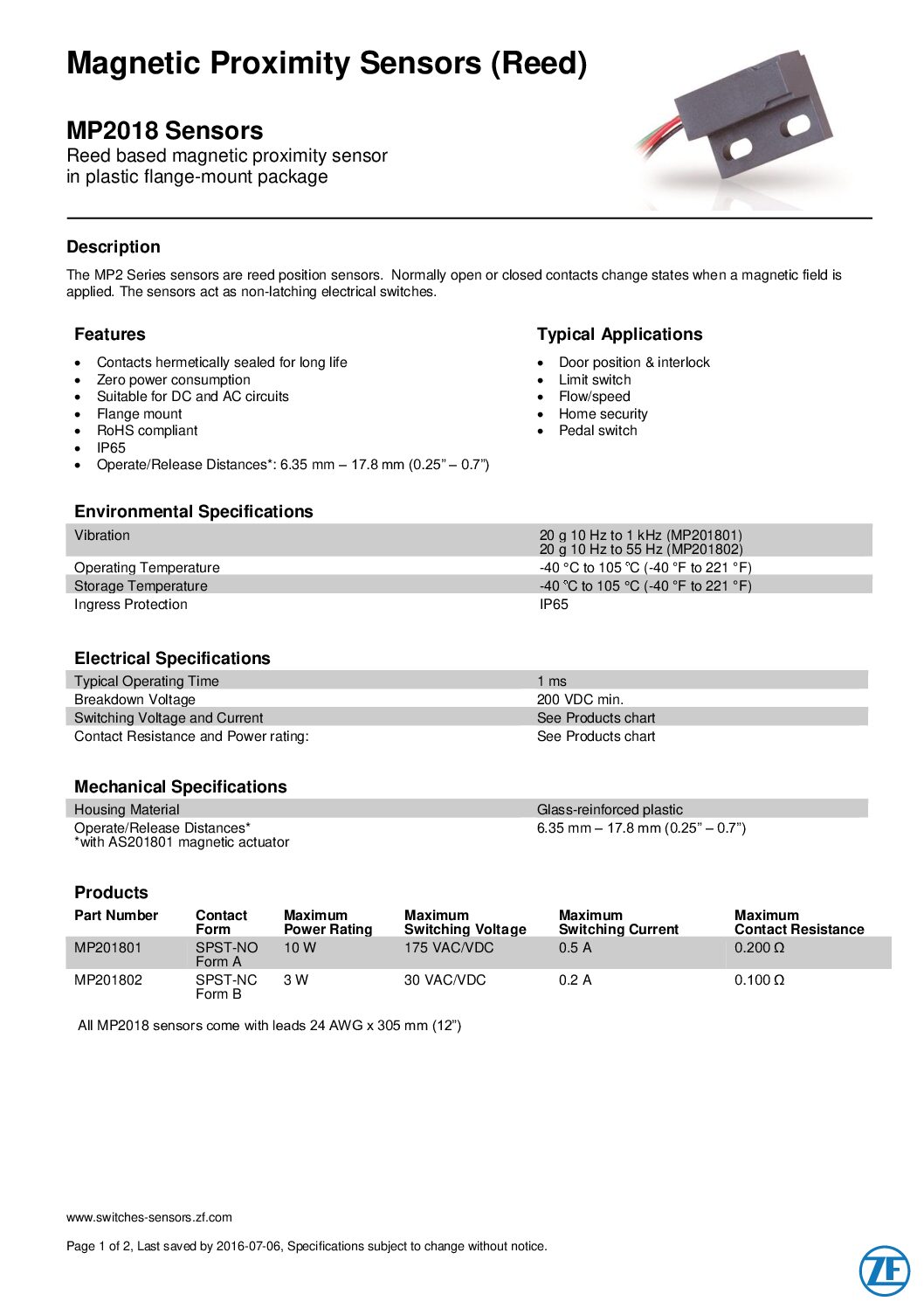 Home Magnetic Proximity Sensors (Reed) MP2018 Sensors 2018_7-MP2018_Magnetic_Proximity_Sensor_Datasheet_A4_EN