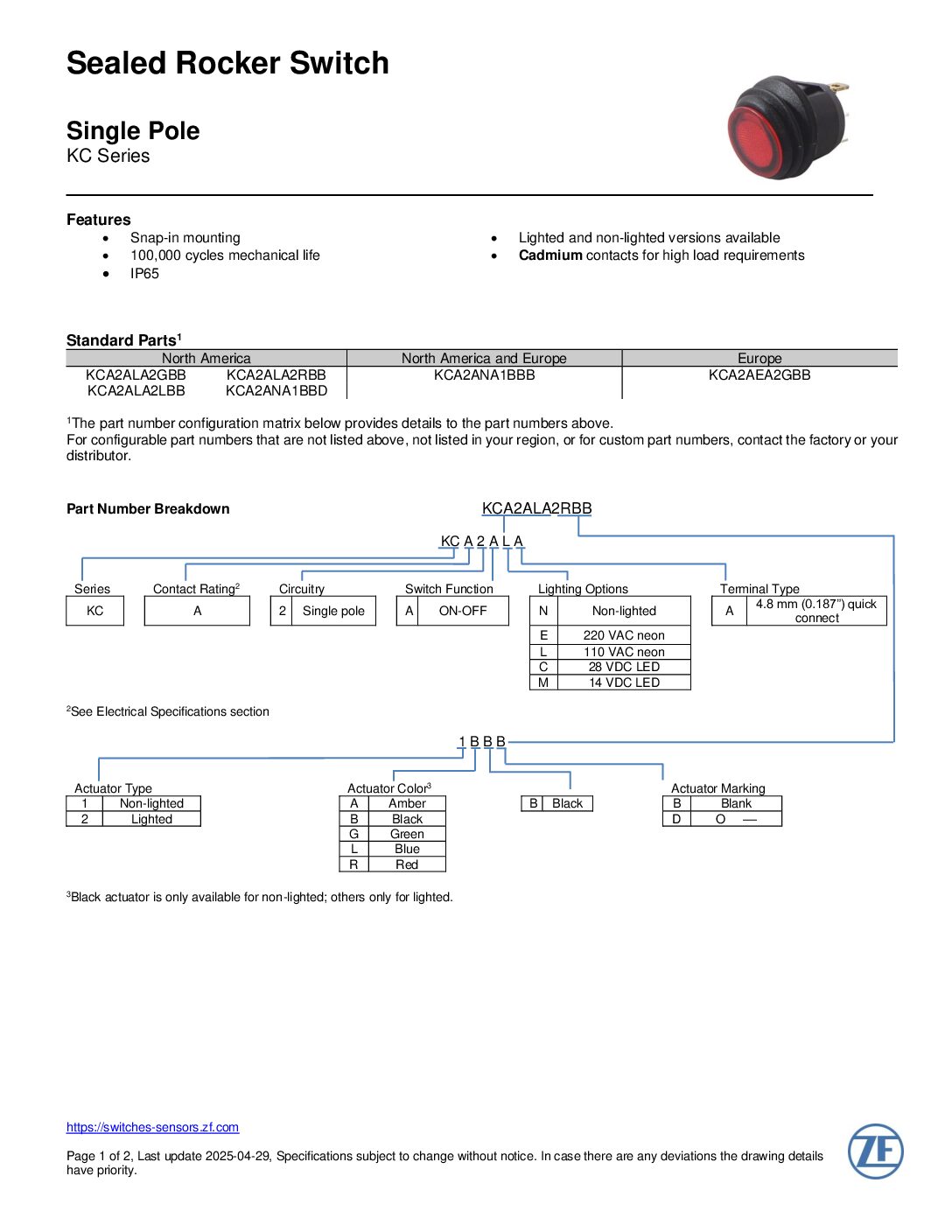 8401 W. 102nd St, Suite 400, Pleasant Prairie, Wisconsin, 53158 T: (+1) 262 942-6500 E: switches-sensors-northamerica@zf.com